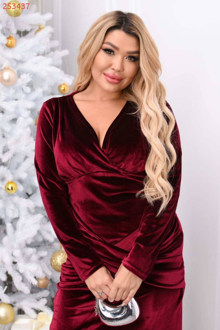 Елегантна приталена сукня із запахом, яка красиво підкреслює фігуру. м’який еластичний бархат, що виглядає розкішно та забезпечує ідеальну посадку.