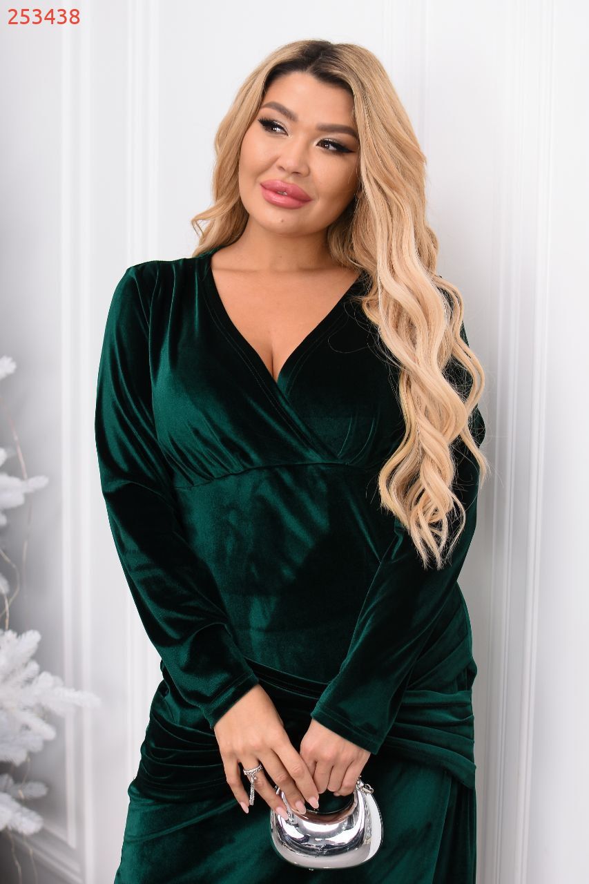 Елегантна приталена сукня із запахом, яка красиво підкреслює фігуру. м’який еластичний бархат, що виглядає розкішно та забезпечує ідеальну посадку.