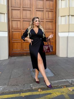 Плаття приталенного крою , ззаду молнія , на талії та рукавах ґудзики , низ та верх плаття на запах.