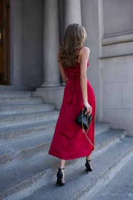 Сукня з ніжного даблшовку з акцентом на декольте - збірка на чашках візуально додає об'єм і підкреслює форму. Ефектний розріз на нозі додає витонченості та легкості. На спині - прихована блискавка та регульована шнурівка з корсетною імітацією для ідеальної посадки по фігурі.