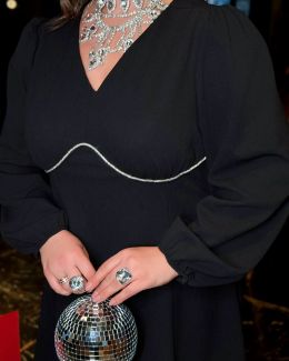 Модель має вільний силует, довгі рукави та витончений виріз. Головний акцент – кант з камінням, який м’яко підкреслює лінію грудей і додає образу святковості та шику.