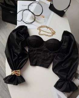 Неймовірно сяючий топ - бюстʼє з імітацією корсету та спущеними пишними рукавами. Тримає форму. Спинка йде на змійці.