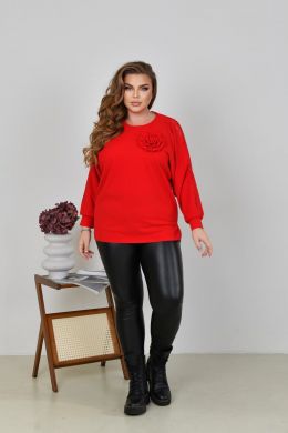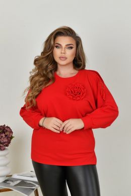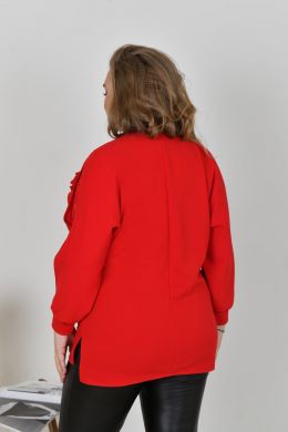 Стильна та вишукана туніка вільного прямого силуету із трикотажу креп-стретч (розтяжність середня), виріз горловини круглий, рукав 3/4. Низ асиметричний, з невеликими розрізами. Туніку декоровано трояндою із основної тканини (за потреби можна зняти). Кишень та застібок немає.