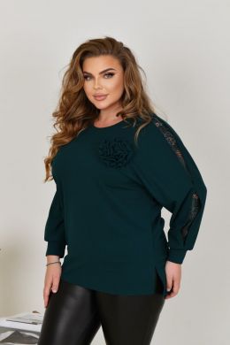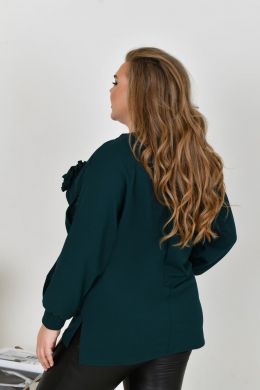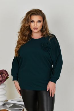 Стильна та вишукана туніка вільного прямого силуету із трикотажу креп-стретч (розтяжність середня), виріз горловини круглий, рукав 3/4. Низ асиметричний, з невеликими розрізами. Туніку декоровано трояндою із основної тканини (за потреби можна зняти). Кишень та застібок немає.