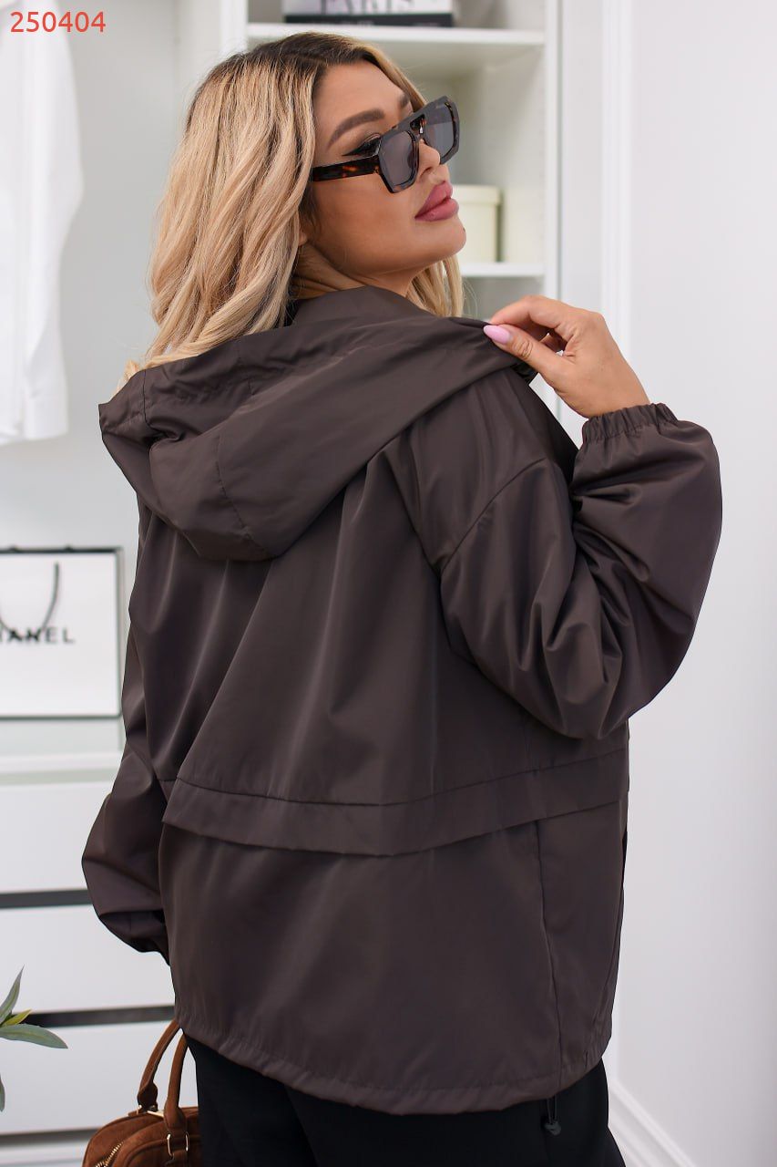 Вітровка з якісної плащової тканини на підкладці: прорізні кишені, рукав реглан, застібка на блискавку по всій довжині, пришивний капюшон, низ із фіксатором для регулювання посадки.