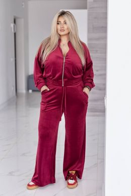 Велюровий оксамитовий костюм складається з кофти і штанів. Кофта вільного крою oversize, з застібкою блискавкою і коміром стійкою. В рельєфних швах спереду є кишені. Рукав зі спущеною лінією плеча, манжети на рукавах та низ кофти на еластичній широкій резинці.