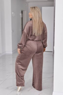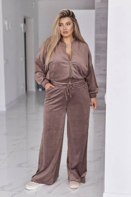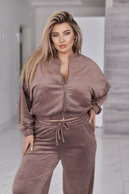 Велюровий оксамитовий костюм складається з кофти і штанів. Кофта вільного крою oversize, з застібкою блискавкою і коміром стійкою. В рельєфних швах спереду є кишені. Рукав зі спущеною лінією плеча, манжети на рукавах та низ кофти на еластичній широкій резинці.
