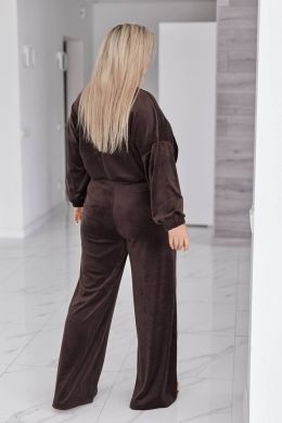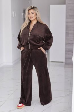 Велюровий оксамитовий костюм складається з кофти і штанів. Кофта вільного крою oversize, з застібкою блискавкою і коміром стійкою. В рельєфних швах спереду є кишені. Рукав зі спущеною лінією плеча, манжети на рукавах та низ кофти на еластичній широкій резинці.