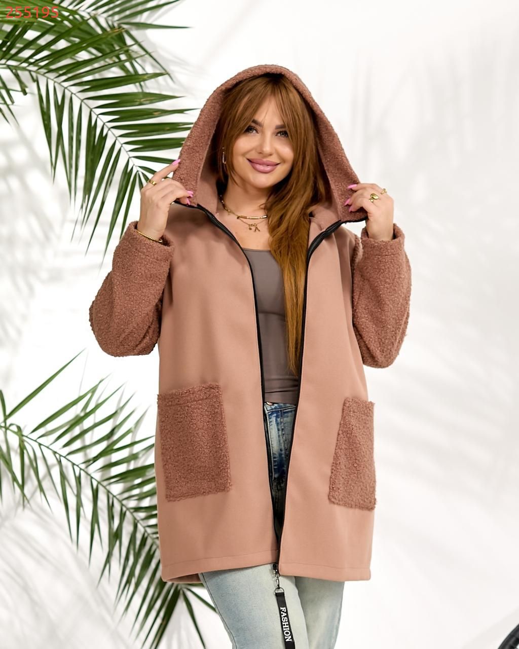 Демісезонне пальто з кашеміру та букле вовни. Виріб вільного силуету, має дві оздобленні кишені з обох боків, з капюшоном, застібка на блискавці, рукав вшивний.