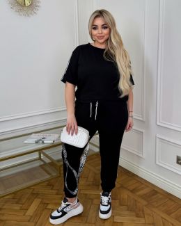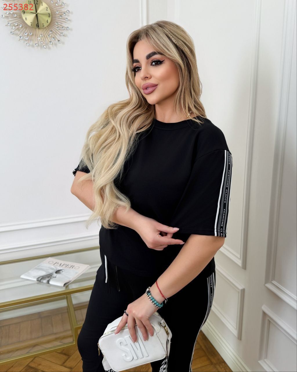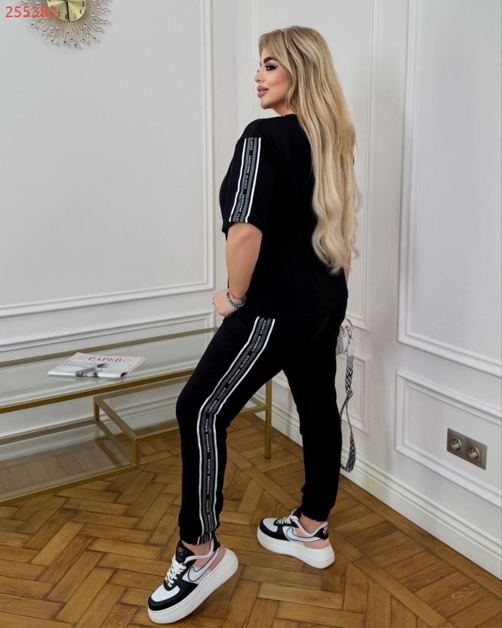 Весняно-літній костюм, футболка + штани, футболка з коротким рукавом і лампасами по рукавах. Штани джогери з кишенями на гумці, в поясі є шнурок, внизу манжета, лампаси з боків