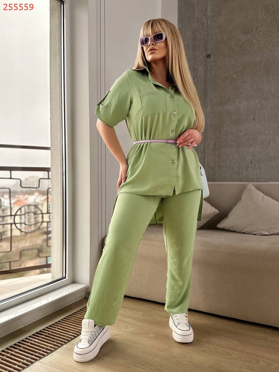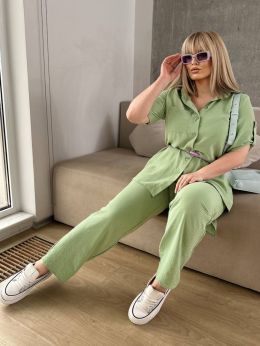 Костюм складається з штанів та сорочки. Штани мають прямий крій та комфортну посадку з гумкою на талії та манжетам. Сорочка вільного фасону з короткими рукавами та застібкою на гудзики. Стильний і сучасний комплект, що чудово підходить для повсякденного гардеробу.