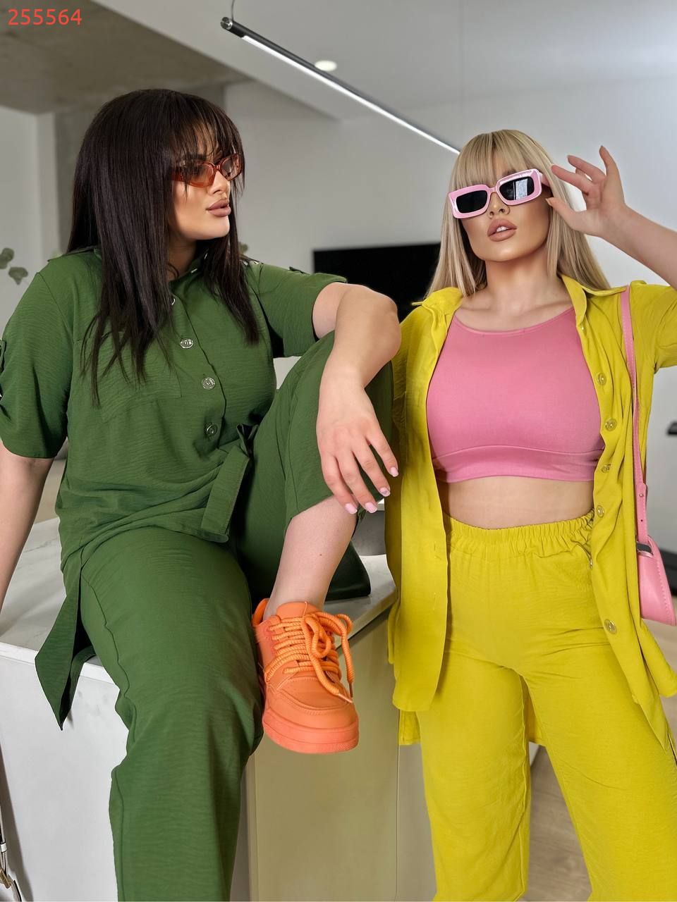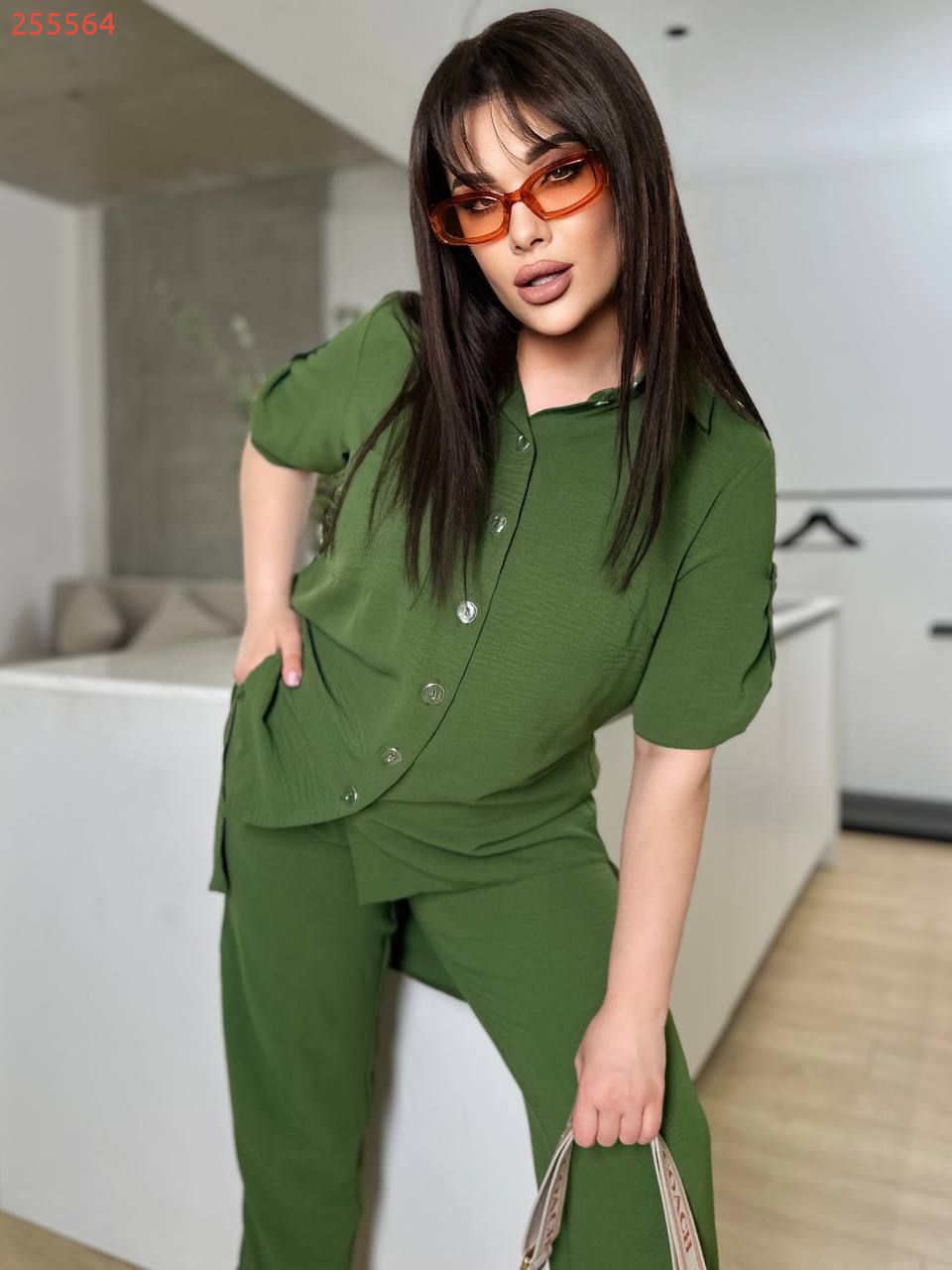 Костюм складається з штанів та сорочки. Штани мають прямий крій та комфортну посадку з гумкою на талії та манжетам. Сорочка вільного фасону з короткими рукавами та застібкою на гудзики. Стильний і сучасний комплект, що чудово підходить для повсякденного гардеробу.