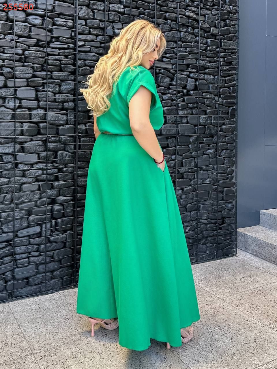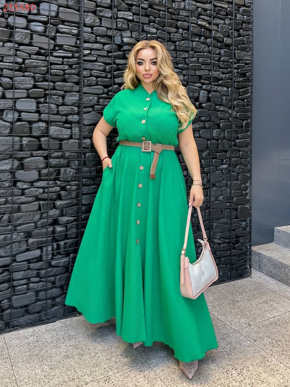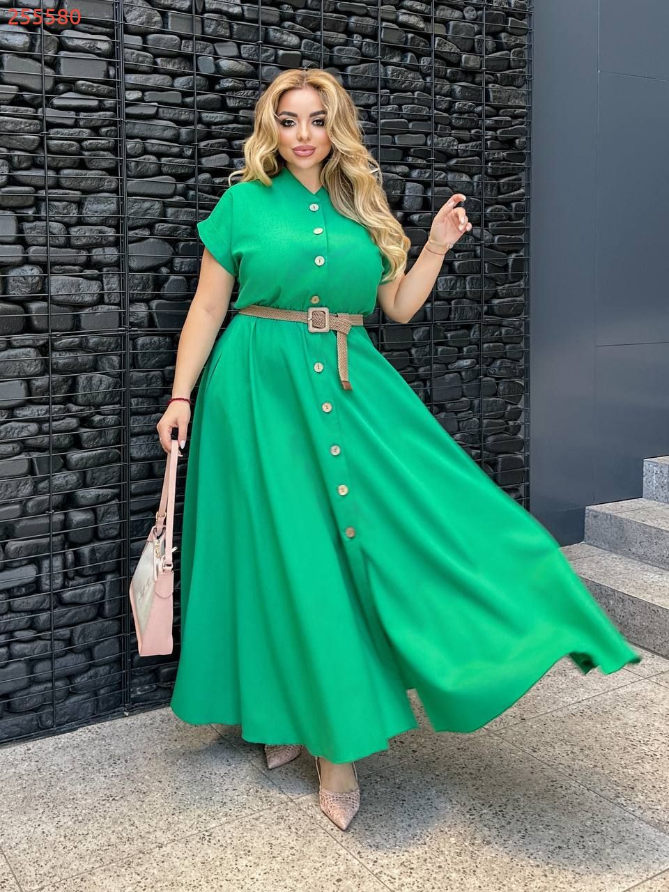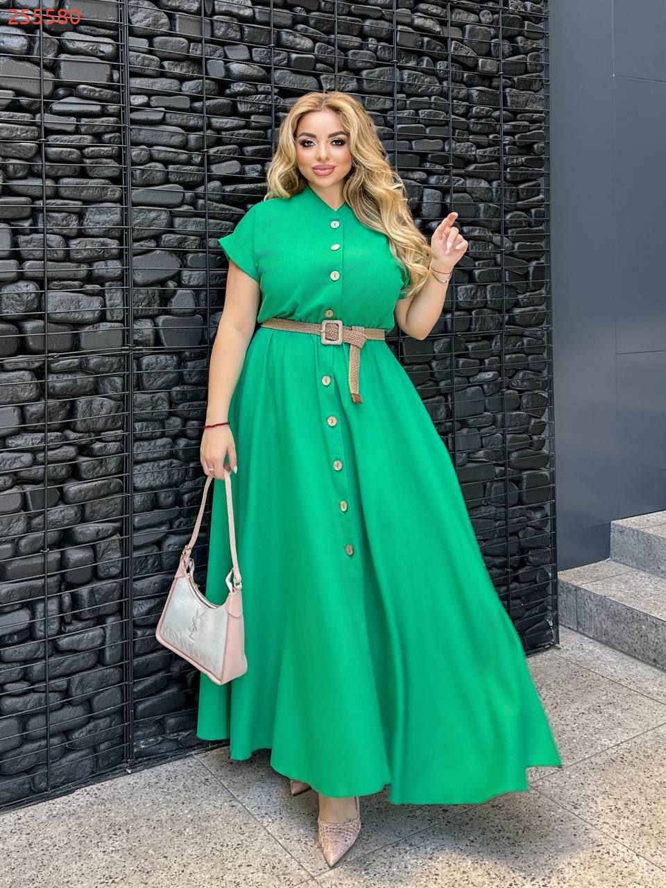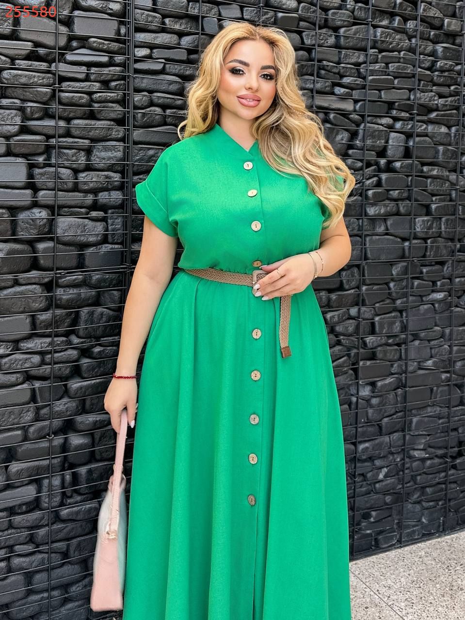Сукня довга, виконана в стилі сорочки. Має короткі рукави з відворотами, круглий комір-стійку та застібку на гудзики по всій довжині. Талія підкреслена ременем. з металевою пряжкою. Вільний крій і легка тканина роблять сукню комфортною та універсальною для літнього гардеробу
